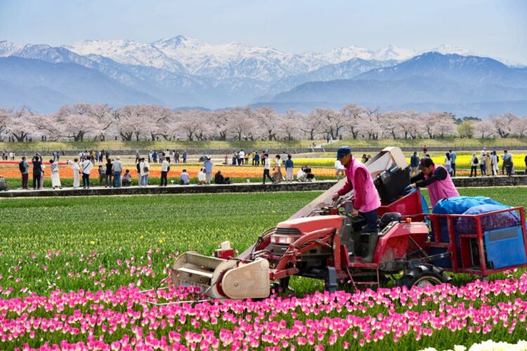 残雪の白馬・朝日岳の北アルプスを背景に、桜並木とチューリップ、菜の花が咲き誇る奇跡の農村の風景。お花見情報や四季折々の便りをお届けします。