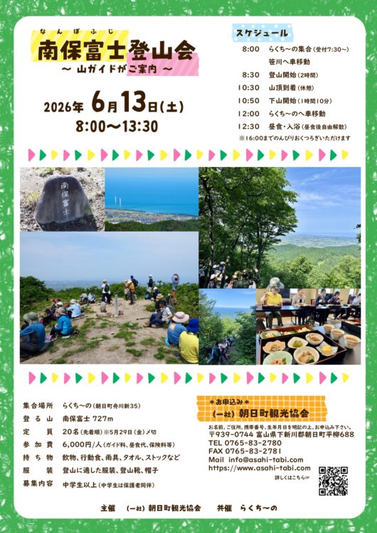 朝日町で小さな富士として親しまれている「南保富士(727m)」に、山ガイドと一緒に登りましょう!