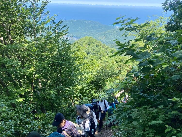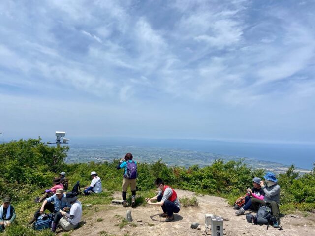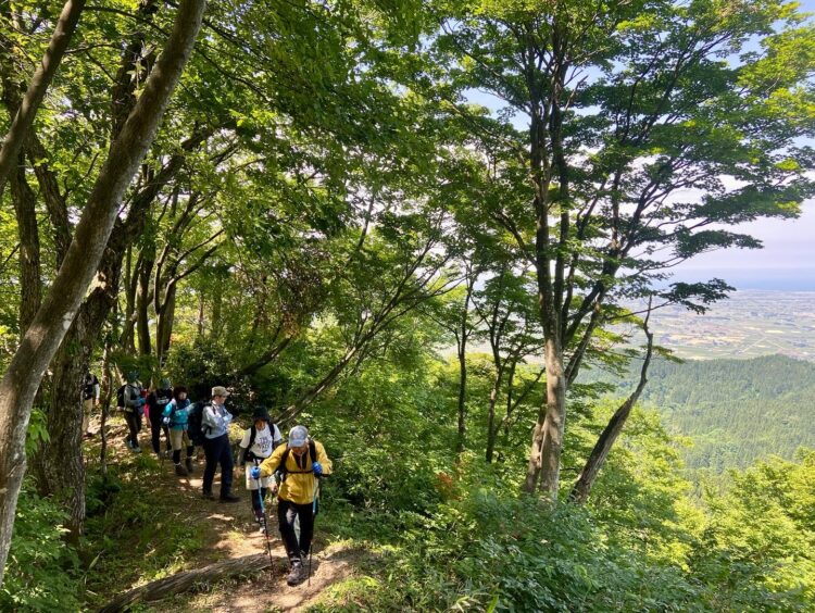 登山道の標識が立つ登山口から、カラマツの植林を過ぎると尾根に取り付き、海岸線と平行に伸びる稜線を小鳥のさえずりを聴きながら登ると山頂に着きます。
