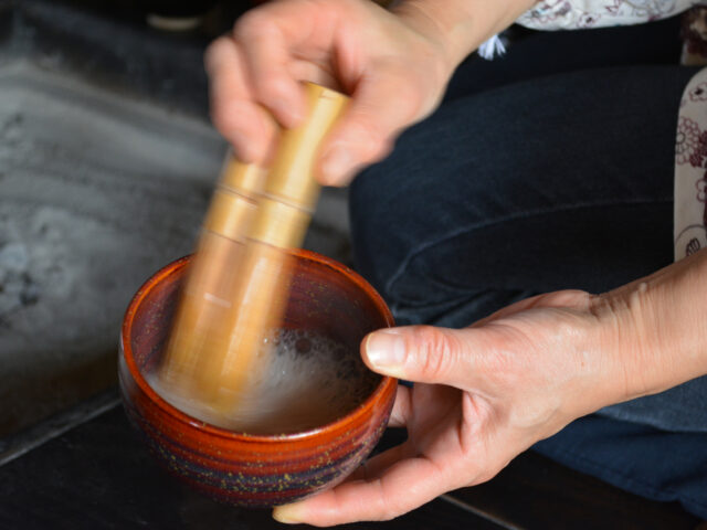 また、お茶を茶筅で泡立てて飲む「振り茶」の仲間で、茶筅を振る動作があせぐらしい(慌ただしい)ことから、”バタバタ茶”と名づけられました。