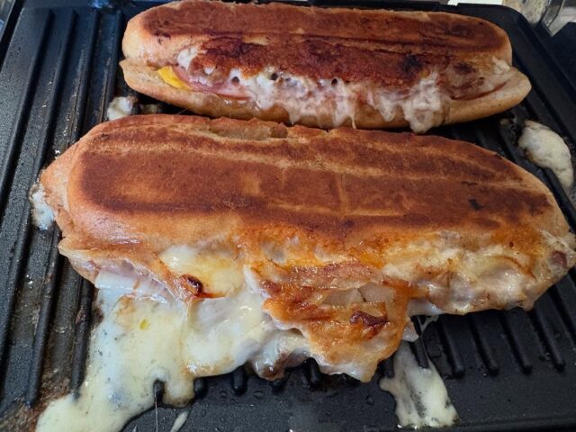 バターでじっくり焼いたカリカリサクサクのバゲットに、具はハム、チーズ、マスタード、レタス、ゆで豚をオリジナルソースと絡めてはさんでいます。