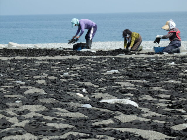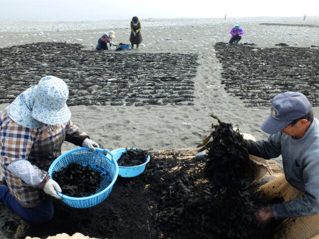 5月中旬、早朝から船を出しワカメを採り、浜辺で手早く捌いたあと、まんべんなくわら灰をまぶし、砂浜に広げて天日干しにします。