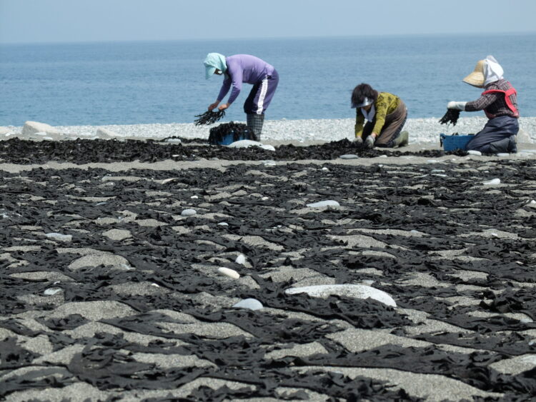 5月中旬、早朝から船を出しワカメを採り、浜辺で手早く捌いたあと、まんべんなくわら灰をまぶし、砂浜に広げて天日干しにします。