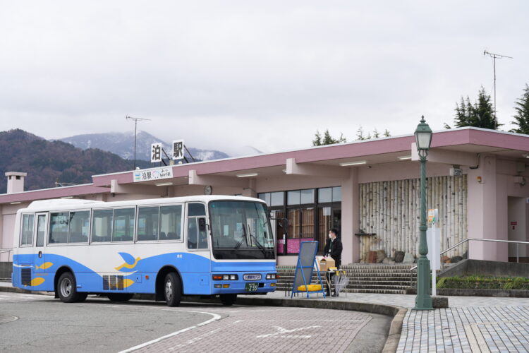 泊駅から会場までは、シャトルバスが片道10分ほどで往復運行します。