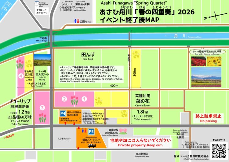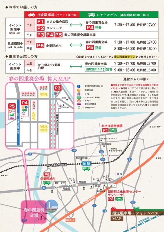 ・駐車場は、P4舟川べり桜並木周辺駐車場(朝日町舟川新468-1)をご利用ください(予約不要)。