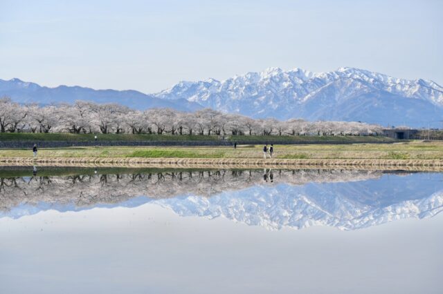 雪を抱く朝日岳・白馬岳の北アルプスを背景に、桜並木とチューリップ、菜の花が咲き誇る「春の四重奏」。